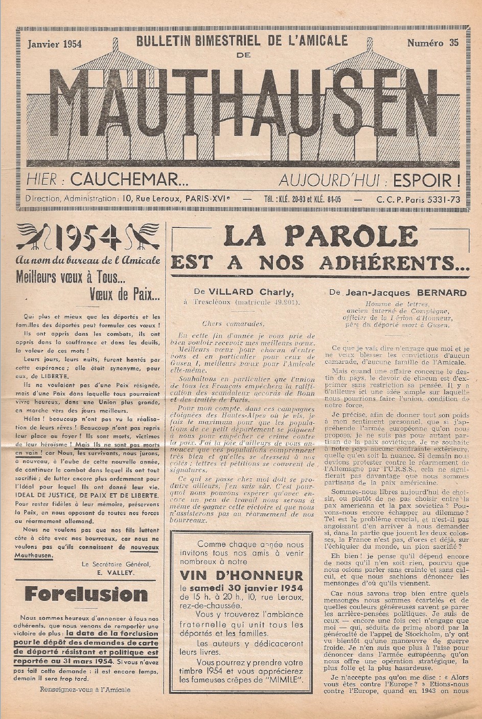 • À la une : Meilleur vœux à tous… vœux de paix… – Émile VALLEY, secrétaire général – Forclusion : report au 31 mars 1954 – Vin d’honneur, 30 janvier 1954