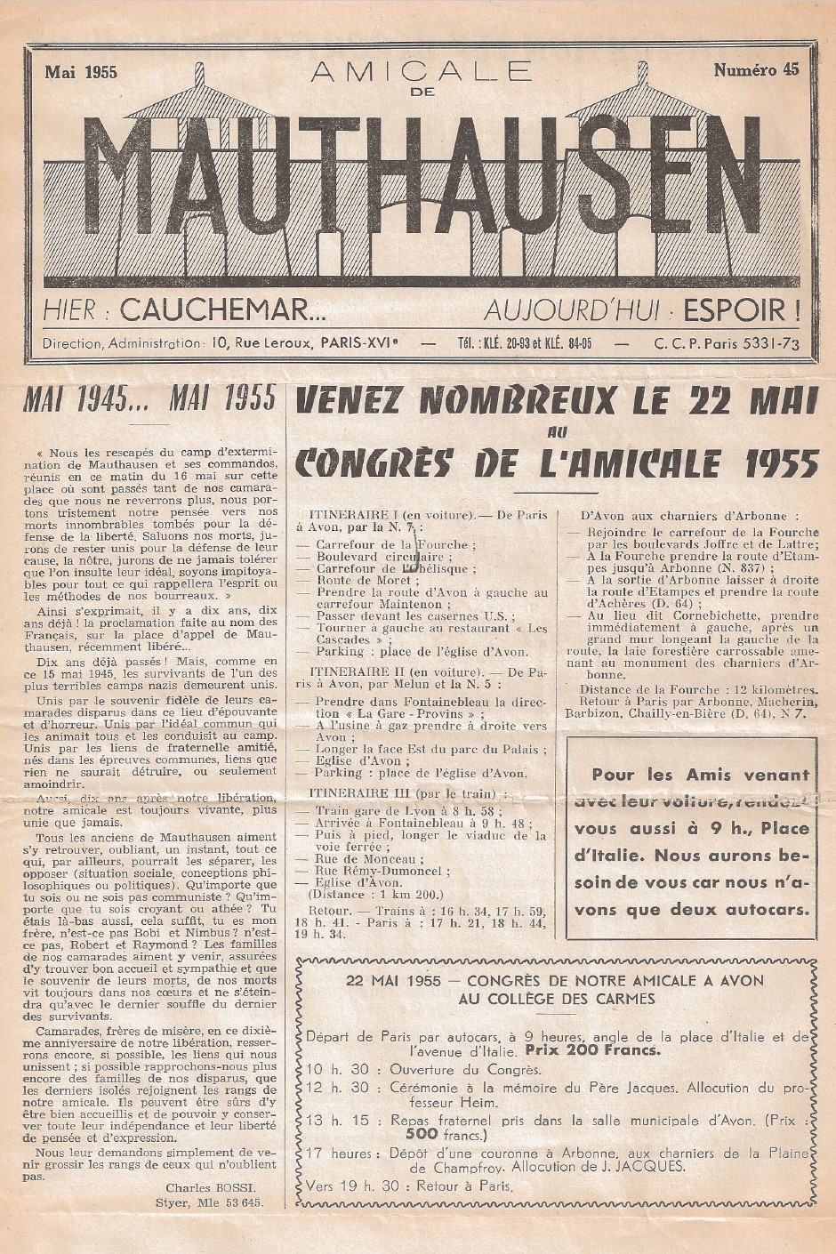 • À la une : Mai 1945… mai 1955 – Charles BOSSI, Styer, Mle 53 645 – Venez nombreux le 22 mai au congrès de l’Amicale 1955