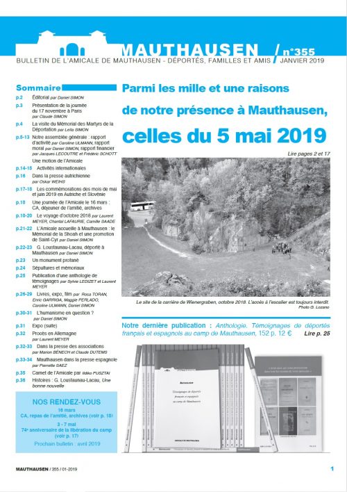 • À la une : Parmi les mille et une raisons de notre présence à Mauthausen, celles du 5 mai 2019 (lire p. 2 & 17) – Notre dernière publication : Anthologie. Témoignages de déportés français et espagnols au camp de Mauthausen (lire p. 25) – Nos rendez-vous