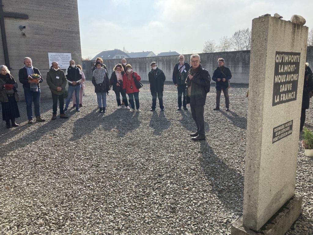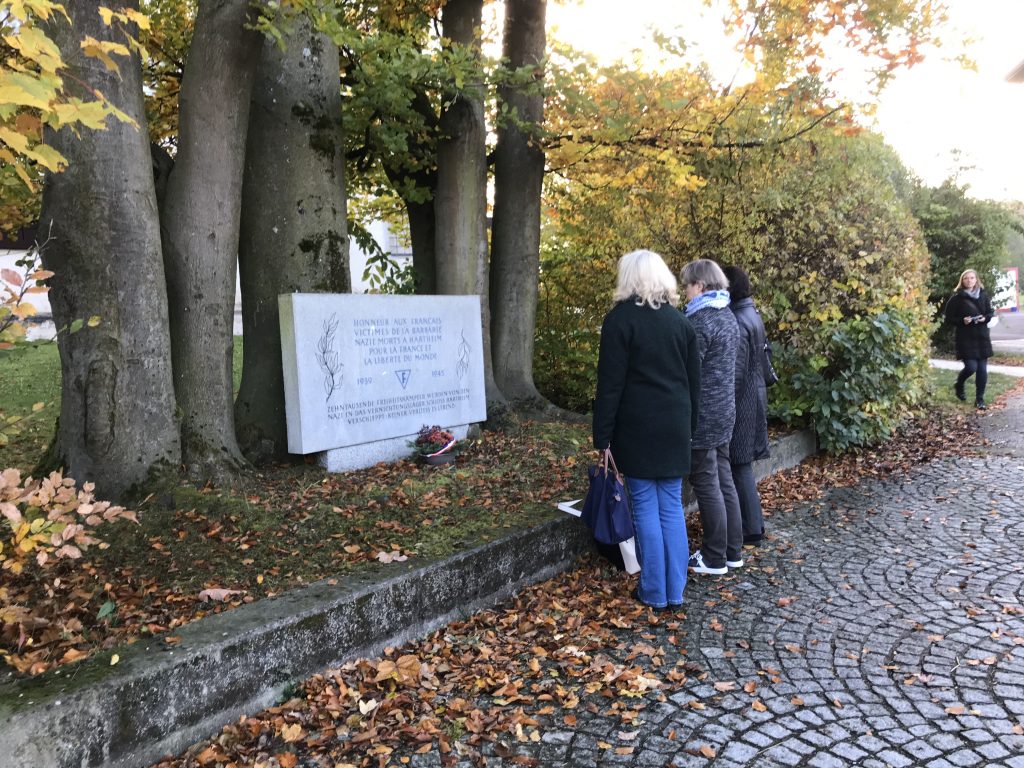 Au château de Hartheim, où furent gazés par les nazis les handicapés physiques et mentaux (Aktion T4) et les détenus de Mauthausen devenus inaptes au travail (Aktion 14f13), le groupe dans la salle de conférence s’apprête à écouter Jean-Louis Roussel.Devant la stèle française, érigée en 1951, les trois petites-filles d’Ernest Chesneau, l’un des 417 détenus français de Mauthausen assassinés au château. À droite de l’image, Ute Bauer.