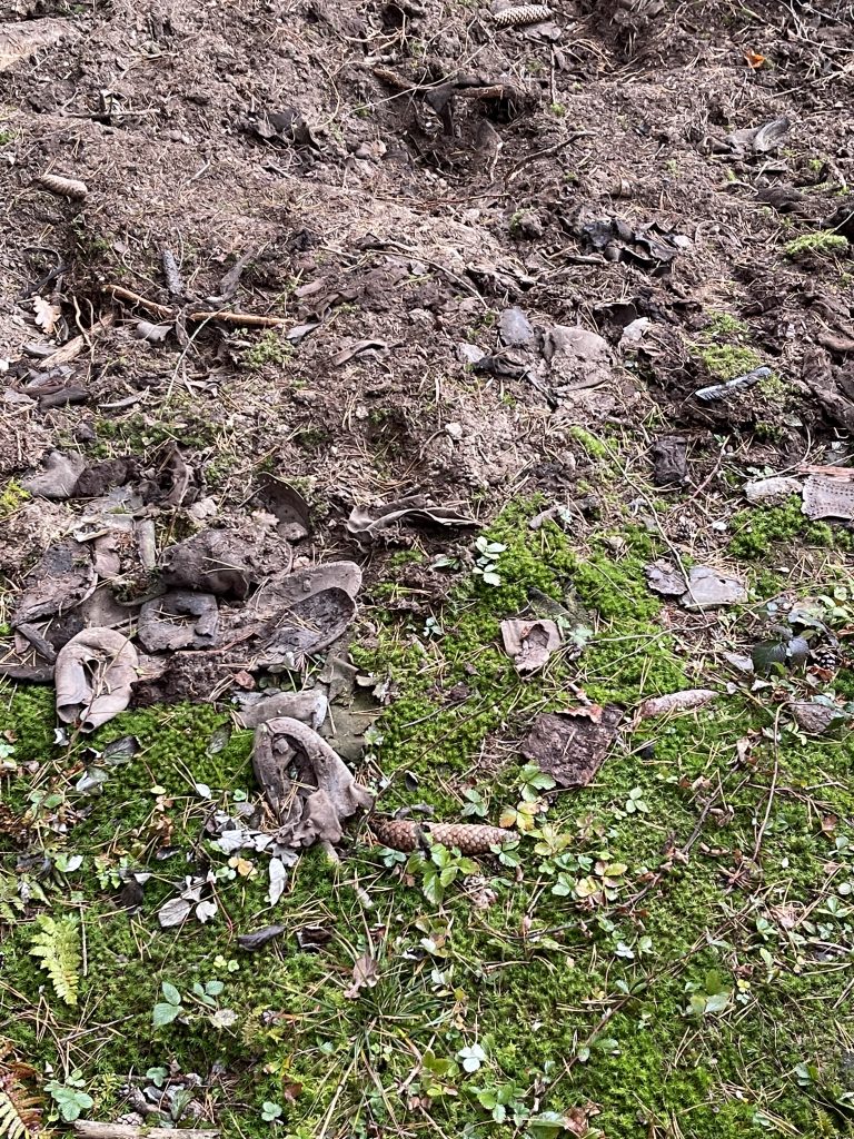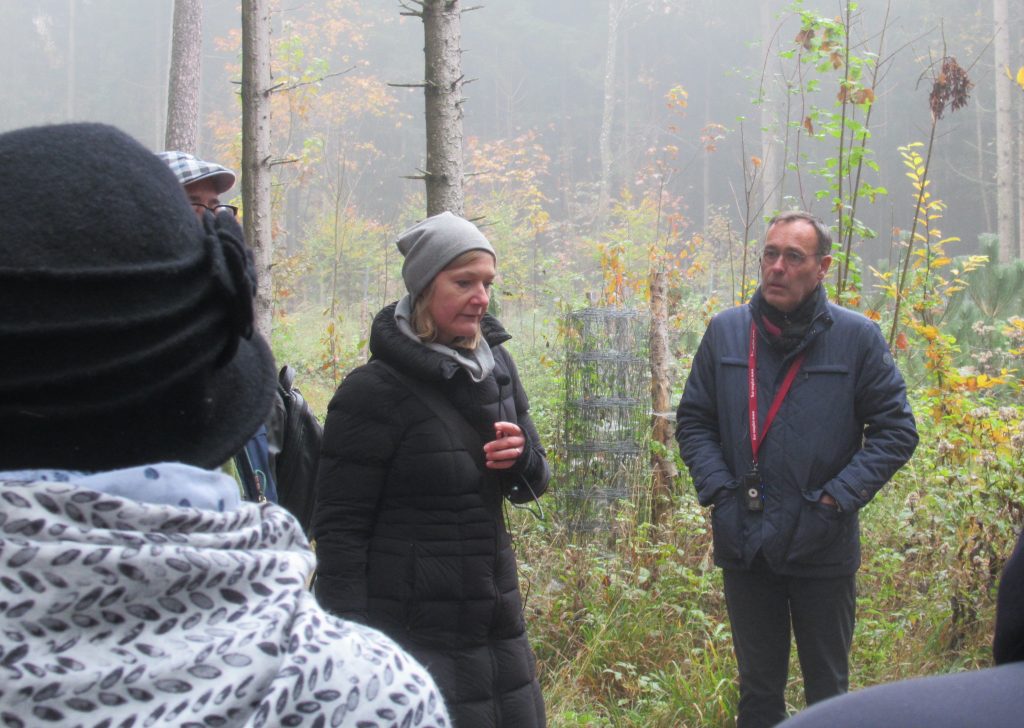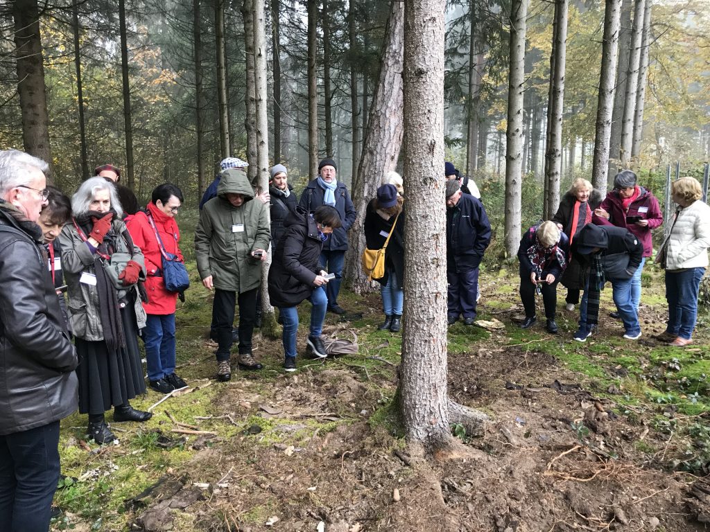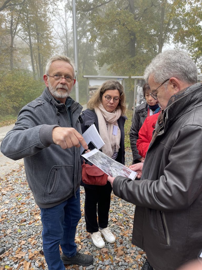 Devant une fouille sauvage où l’on retrouve encore, soixante-seize ans après, des objets ayant appartenu à des détenus juifs transférés à pied, les dernières semaines, et condamnés à la mort par la faim et l’épuisement.Le sol du sous-bois.Ute Bauer, du BM.I (ministère de l’Intérieur), présente l’état du site et les efforts pour sa conservation.Devant la stèle du BM.I.